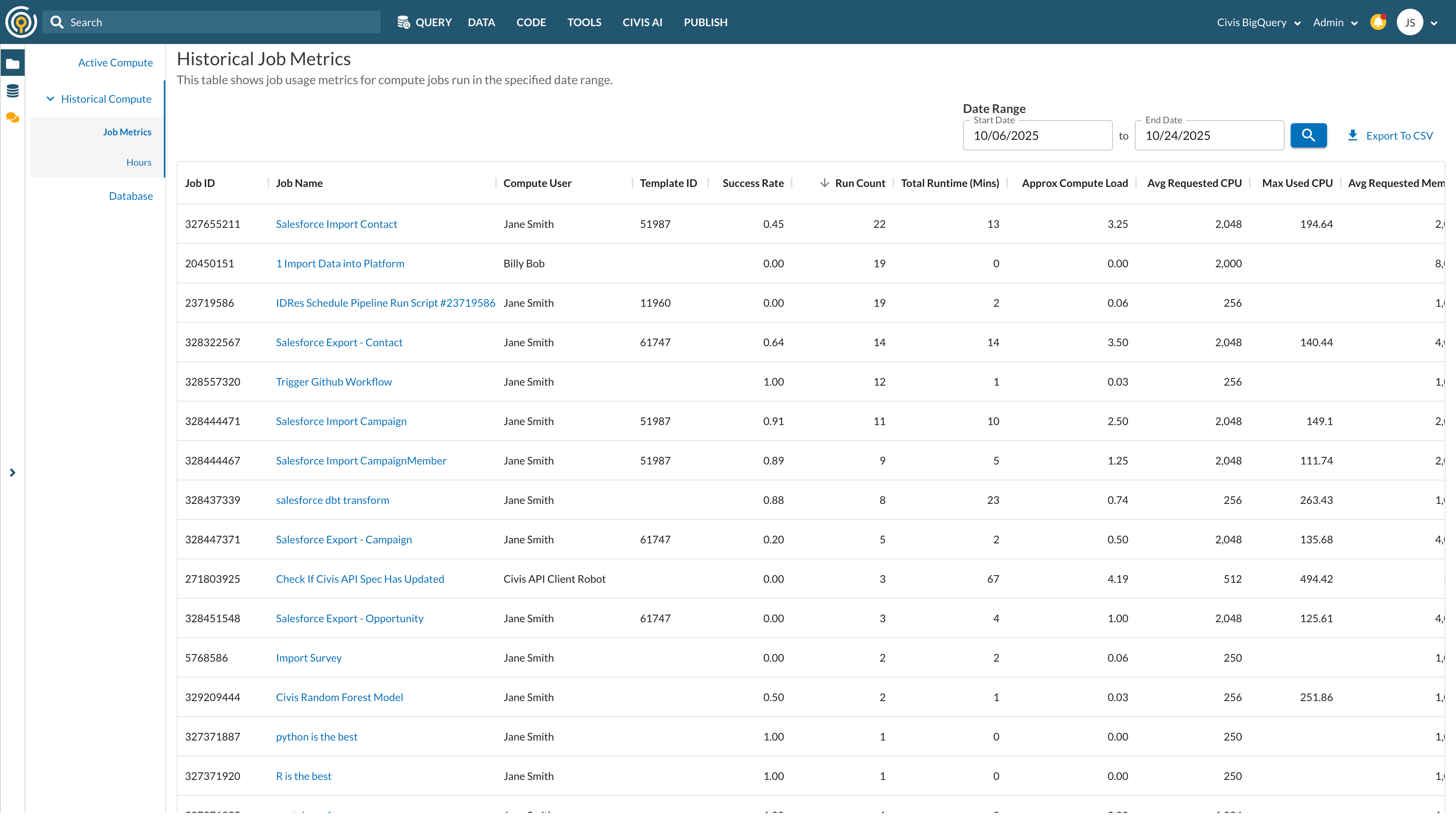 Get organization-wide visibility into compute-intensive jobs and usage patterns across the Civis platform. Job Metrics helps organization admins quickly identify anomalies, understand what’s driving platform activity, and spot optimization opportunities—without digging through logs or guessing.